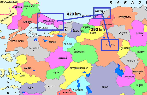 Bartin is located nearby Istanbul (is the biggest city of Turkey) and Ankara (is the capital of Turkey), and the only transportation from those city to Bartin is via coaches or vehicles. It takes 6 and 4 hours to arrive Bartin from Istanbul and Ankara by coaches, respectively. For this reason, visitors who want to visit our department, can fly to Istanbul and Ankara, and then they can take a coach or rent a car. There are several coach services in every day. (See the fourth figure for map)